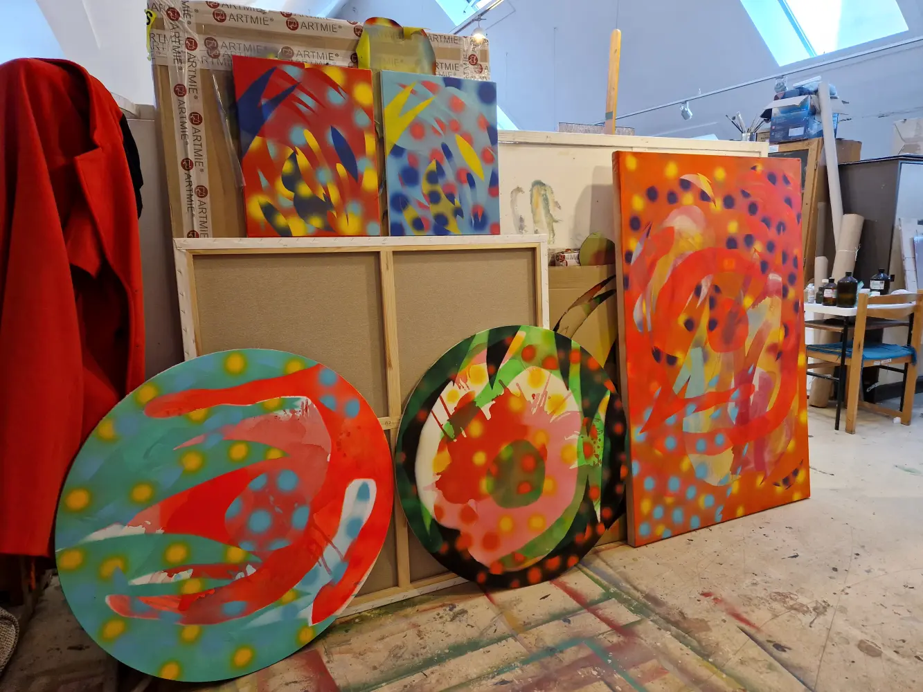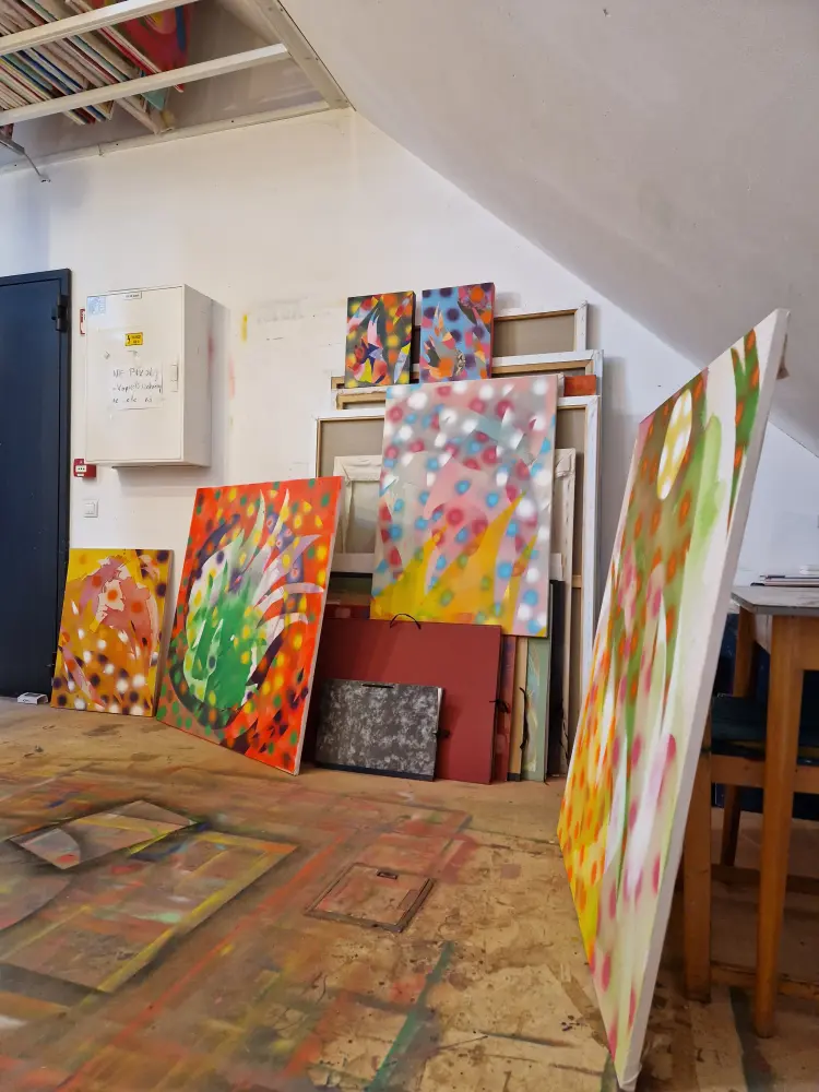 Festészeti munkámban túlnyomó többségben sorozatokban gondolkozom. Az egyes sorozatok sokszor 10-30 vagy akár 40 munkából állnak, amiket ugyanarra a tematikára építek fel és a különféle megfogalmazási/formázási módokkal kísérletezem az individuális vásznakon. Mondhatjuk, hogy a festészetem a variációk egy témára fantázianevet is viselhetné. Anyag használatomban preferálom az akrilfestéket és a festék sprayt, amikkel izgalmas és vibráló felületeket tudok létrehozni. A munkámat jellemzi a kísérletezés és a színekkel való játék valamint a finom rétegek felépítése és formák létrehozása kézzel készített stencilek segítségével. Foglalkoztatnak az absztrakt gondolati és egzisztenciális sík különféle dimenziói, az alkotásaimban ezeknek a belső rétegeknek a kavargó, különös és szemi-transzparens világát igyekszem bemutatni. Hogyan ölt formát egy gondolat és érzés, hogyan lehet ilyen és ehhez hasonló elvont koncepciókat átültetni a fizikai valóság síkjára? Ezekre a kérdésekre próbálok választ találni a festészet segítségével. A rétegek sok helyütt átlátszóak, mintázottak, rálátást engednek az alattuk található rétegre, portál szerűek, ezzel erősítve rá ennek a nem materiális síknak a dinamikusságára. A jövőben mindenképp szeretnék nagy hangsúlyt fordítani a jelenlegi palettám bővítésére mind színbeli, mind formbabeli tekintetben, valamint tovább csiszolni a koncepcióim megvalósításához szükséges technikai képességeim.
