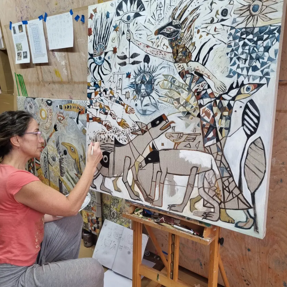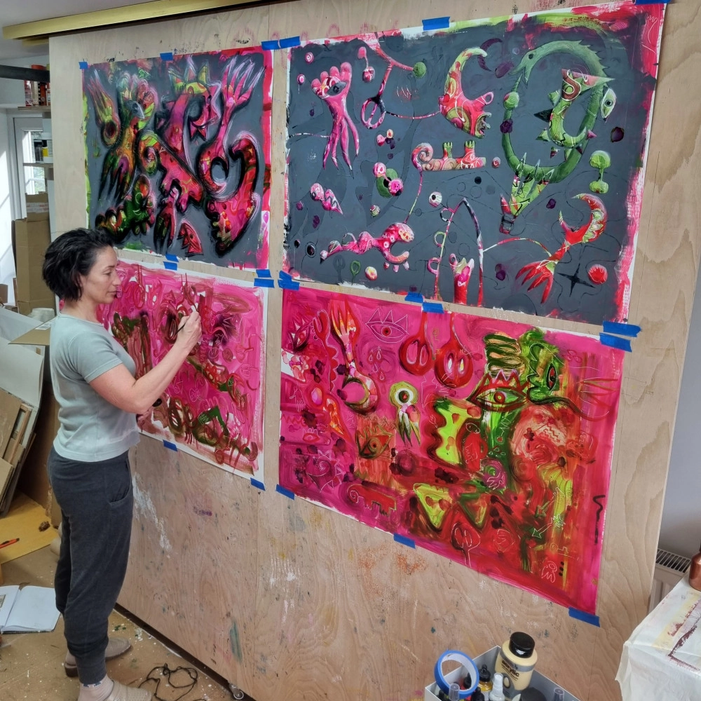 Ponyiczki Szilvia, Magyar származású, Angliában élő képzőművész. A kollektív tudattalan vizuális megjelenítése foglalkoztatja, munkáiban ősi szimbólumokat és teremtéstörténeteket sző össze. A Nottingham Trent Egyetemen szerzett képzőművészeti mesterdiplomát 2020-ban. Festményeiben személyes álomképeket olvaszt össze az ősi civilizációk ikonográfiájával, így alakítva ki sajátos vizuális nyelvét. Hibrid formái és alakjai az élet körforgását, az átalakulást és a spirituális transzcendenciát tükrözik, időtlen önfelfedező útra invitűlva a nézőt. Munkái Magyarországon, az Egyesült Királyságban és nemzetközi szinten is megjelennek, mind egyéni, mind csoportos kiállításokon. Elismerései közé tartozik az East Midlands-i Claire Peasnall festészeti díj (2024), MMA különdíj (2018, Groteszk Triennalé, Kaposvár) valamint alkotói támogatások (NKA ill. DYCP – Arts Council England). Művészi gyakorlatán keresztül arra törekszik, hogy feltárja a múlt, jelen és jövő közötti kapcsolatokat, és egyedi nézőpontból közelítse meg az emberiség kollektív tudattalanjának időtálló bölcsességét.
