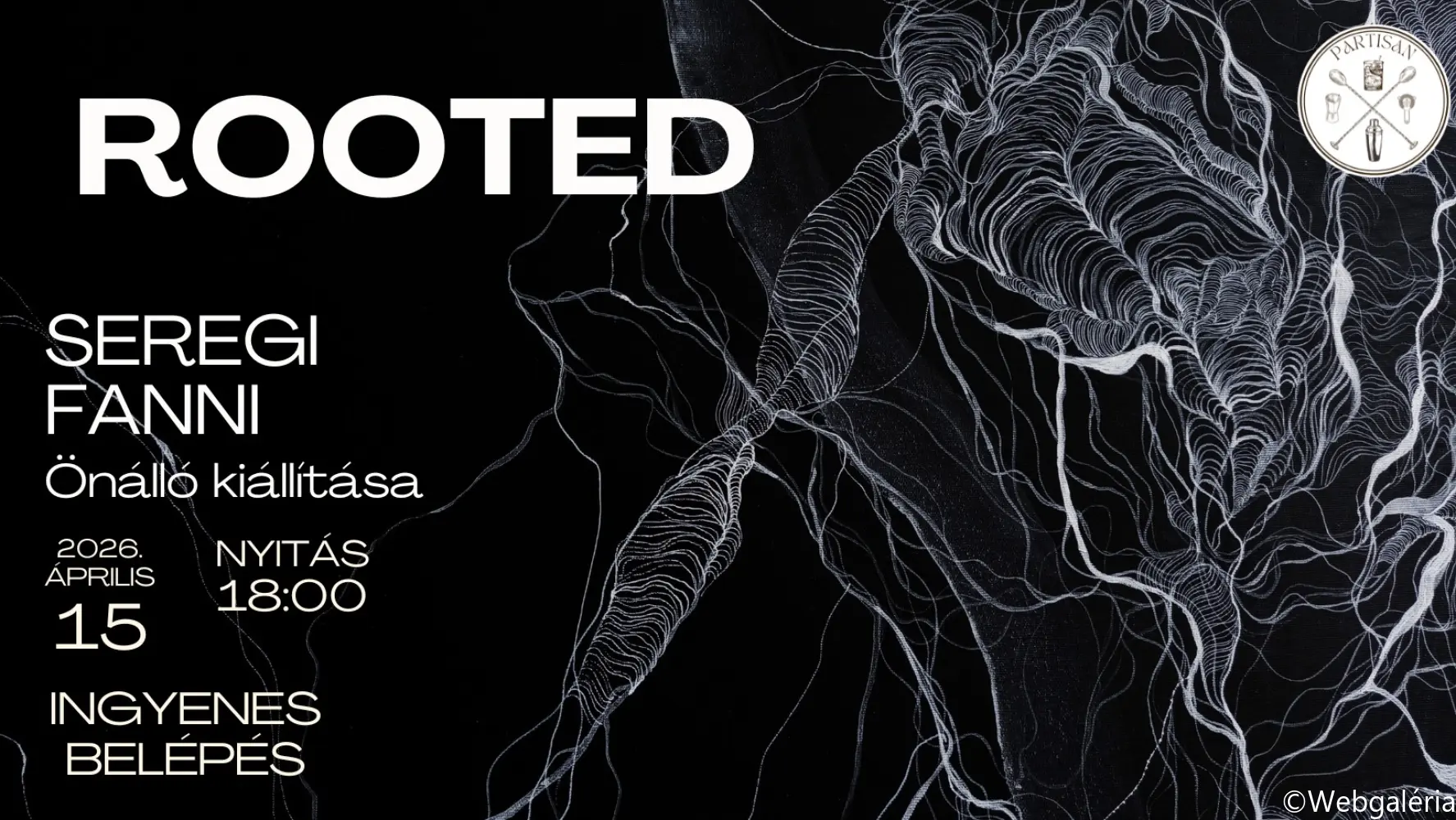 Április 15-én újabb különleges kiállítással várunk titeket a Partisanban! Seregi Fanni önálló tárlatával mutatkozik be, ahol megismerhetitek az alkotói világát és egyedülálló műveit. -ROOTED- A Rooted címet viselő kiállítás a növényi létezés rejtett, sötétségbe burkolózó tartományába, az elképzelt gyökérzetek világába enged bepillantást. Munkáim a látható és a láthatatlan peremén létező organikus formarendszerek, és azok absztrakt megjelenítése köré szerveződnek. A festészet és a rajz ötvözéséből létrejövő munkák fókuszában a sötét, mély alapon kirajzolódó, fehér vonalhálózatok állnak. Képeimen egy lehetséges növényi rendszer kapcsolódásait és folytonos áramlását igyekszem megragadni. Link az eseményhez: https://fb.me/e/3SbBuGYuL